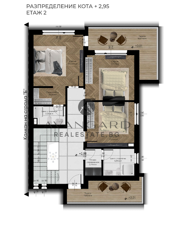 Етаж 2: Родителска спалня със собствена гардеробна и баня с тоалетна, две допълнителни спални, баня с тоалетна, перално помещение и две тераси.